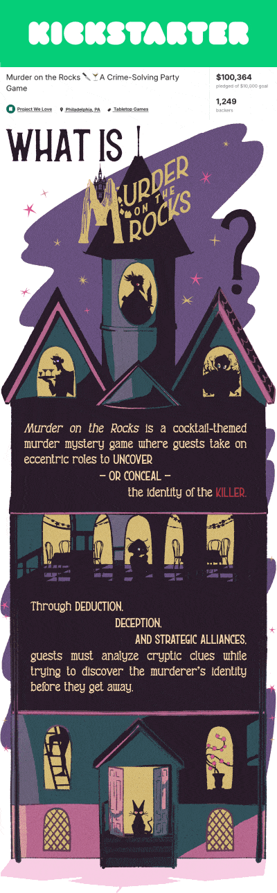 A party game designed and produced by Misfit Mixers. I illustrated 100 cards across the base game and two expansions, and handled packaging, extra assets, and the full Kickstarter campaign page.